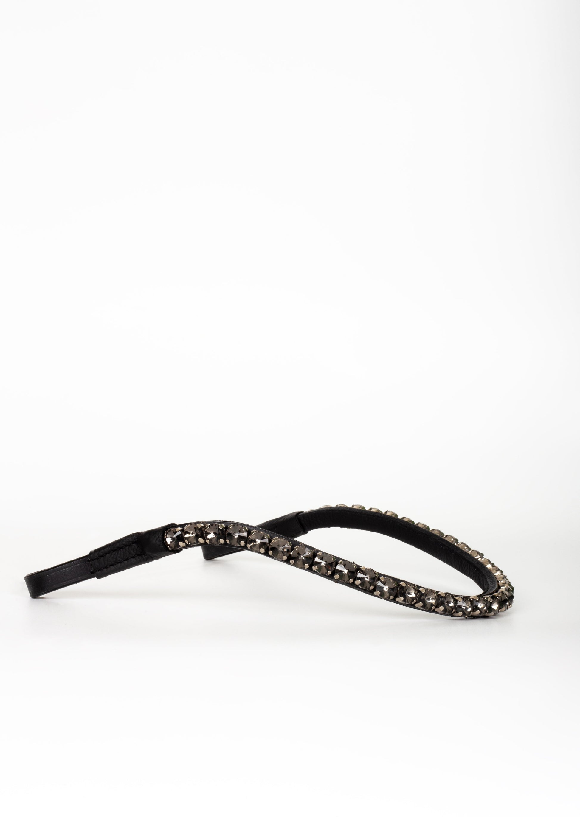 Außergewöhnlich eleganter Stirnriemen aus Leder mit tiefem Bogen und einer Reihe großer grauer Kristalle.